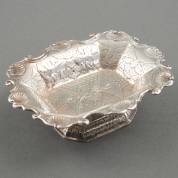 Gedreven 1e gehalte zilveren kandijbakje met gegraveerde motieven en palmetdecor, meester: Paulus Vermeulen, Haarlem, 1762, vergelijkbaar model in Rijksmuseum Twente, gewicht 74 gram, circa 4 × 12 × 9 cm