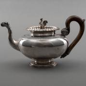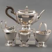 Vierdelig 1e gehalte zilveren theeservies met filetranden, bestaande uit theepot, roomkan, suikermand en lepelvaasje, meester: Hendrik Arnoldus Poelman, 's-Gravenhage, 1924 en 1925, lepelvaasje afwijkende meester, 1937, brutogewicht 1011 gram, theepot circa 16 × 25 × 9 cm