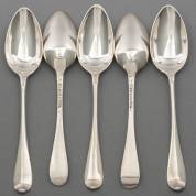 Vijf 1e gehalte zilveren lepels, Hollands glad, meester: H. Vrijman, Rotterdam, 1804, gewicht 350 gram, lengte circa 22 cm