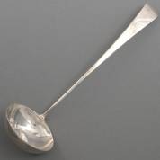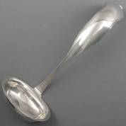 Zilveren soepdienlepel, de steel met monogram onduidelijk gekeurd, 18e/vroeg 19e eeuw, gewicht 304 gram, lengte circa 34 cm -zware gebruikssporen-