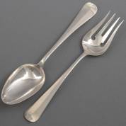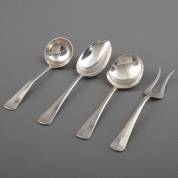 Vierdelig 1e gehalte zilveren (999/1000) diengerei Haags lof, bestaande uit aardappellepel, groentedienlepel, vleesvork en sauslepel, 1988, gewicht 354 gram, lengte groentelepel 23 cm