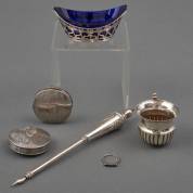 Divers klein zilverwerk, diverse gehaltes: twee geribbelde pillendoosjes -deukjes-, bekertje, ajourgezaagd bakje met blauw glazen binnenbakje, jat, en rijringetje, gewicht zilver 133 gram, lengte jat 21,5 cm