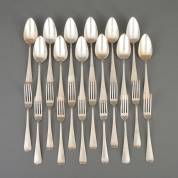 Twaalf 2e gehalte zilveren dinercouverts, Haags lof, meester: J.M. van Kempen & Zonen, Voorschoten, begin 20e eeuw, gewicht 1485 gram, lengte circa 21 cm, in cassette -deels gemonogrammeerd-