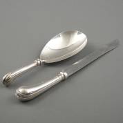 2e gehalte zilveren rijstschep en broodmes met 2e gehalte zilveren pistoolheft, beide meester: J.M. van Kempen & Zonen, Voorschoten, 1919, brutogewicht 298 gram, broodmes 33 cm