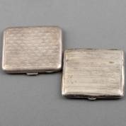 Twee 2e gehalte zilveren sigarettenkokers met vermeil binnenzijde, gewicht 192 gram, circa 8,5 × 8 cm