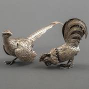 1e gehalte zilveren fazantje en 2e gehalte zilveren strooier in de vorm van een haan, 1964, gewicht 240 gram, haan circa 9 × 10 × 3 cm -staart fazant gebroken-