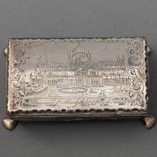 2e gehalte zilveren tabaksdoos, de deksel met gegraveerd decor van paleis en inscriptie 'Paleis van Volksvlijt te Amsterdam', 1866, later vermaakt tot lepeldoosje door er vier pootjes aan te solderen, gewicht 151 gram, circa 4 × 13 × 8 cm