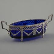 Schuitvormig 2e gehalte zilveren schaaltje met blauw glazen binnenbak en gedecoreerd met portretmedaillons en guirlandes, Louis Seize-stijl, meester: Herman Hooijkaas, gewicht zilver 97 gram, circa 7 × 20 × 7 cm