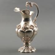 Gebombeerde 2e gehalte (916/000) zilveren schenkkan met decor van bladeren en rocailles, Portugal, gewicht 804 gram, hoogte 33 cm -deukjes-
