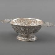 Zilveren Friese brandewijnkom met ajourgezaagde platte oren met decor van een mascaron en twee putti, de kom met rijk gedreven decor van vogels en voluten, de bovenrand gemonogrammeerd 'AE' en 'PE', onduidelijk meesterteken, Sneek, 1764, gewicht 192 gram, 7,5 × 24,5 × 12 cm -oren opnieuw aangezet, restauratie aan binnenzijde kelk bij aanhechting voet-