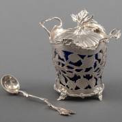 Ajourgezaagde 1e gehalte zilveren mosterdpot met rijk bladdecor en blauw glazen binnenbakje, meester: Cornelis de Haan, 's-Gravenhage, 1775, daarbij: zilveren mosterdlepel met bladdecor, vermoedelijk van later datum, gewicht zilver 225 gram, circa 10 × 11 × 8 cm -scharnierpinnetje ontbreekt-