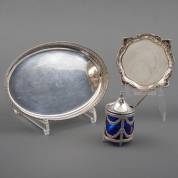 Ovaal 2e gehalte zilveren dienblaadje met opstaande eierlijst afgezet met parelrand, schaaltje met rocailledecor op de rand, en 2e gehalte zilveren mosterdpotje met blauw glazen binnenbakje en 1e gehalte zilveren lepeltje, gewicht zilver 309 gram, dienblad circa 2 × 22 × 15 cm