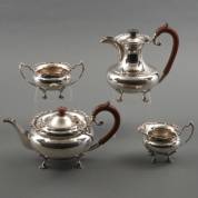 Vierdelig 1e gehalte zilveren koffie- en theeservies met geaccoleerde randen, bestaande uit: theepot, koffiekan, suikerschaal en roomkan, alle op vier sierlijke pootjes, meester: Martin Hall & Co, Londen, 1804, brutogewicht 1969, koffiekan circa 20 × 20 × 14 cm -greep theepot los, maar aanwezig-