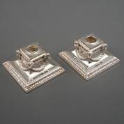 Paar 1e gehalte zilveren lage kandelaars, vierkante voet met gedreven palmet- en guirlandedecor, de stam gesierd met vier ramskoppen, verzwaarde voet, brutogewicht 925 gram, 7 × 11 × 11 cm -gebruikssporen-
