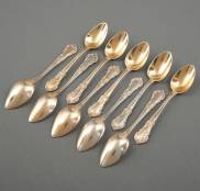 Tien verguld 3e gehalte zilveren koffielepels, de stelen gedecoreerd met medaillon, meester: Cloude Doutre Roussel, Parijs, circa 1900, gewicht 130 gram, lengte 14 cm