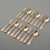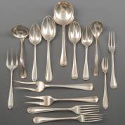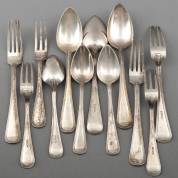 2e gehalte zilveren bestekgedeelte, Haags lof, diverse meesters en jaren, bestaande uit: zes dinercouverts en zeven dessertcouverts, en een extra dessertlepel, lengte dinercouverts 21 cm, gewicht 1505 gram