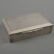 Rechthoekige 2e gehalte zilveren sigarendoos met geguillocheerd decor en houten interieur, brutogewicht 637 gram, circa 5 × 21 × 13 cm