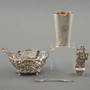 1e gehalte zilveren beker gemonogrammeerd 'K L', daarbij 2e gehalte zilveren bonbonmandje, zilveren flessenstop en 2e gehalte zilveren vorkje, gewicht 259 gram -diverse defecten-