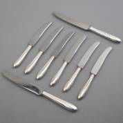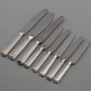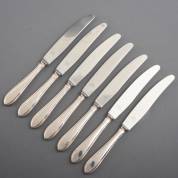 Zes dessertmessen met 2e gehalte zilveren heft, daarbij twee dinermessen met hetzelfde 2e gehalte zilveren heft, model 400, ontwerp Gustav Beran voor Koninklijke Nederlandse Van Kempen & Begeer, Zeist, jaren '50 en '60, brutogewicht 538 gram, groot circa 24 cm, klein circa 20,5 cm