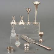 Divers zilverwerk, diverse gehaltes, waaronder: twee anjervaasjes en twee lage kandelaartjes, grootste anjervaas 18 × 7 cm -diverse defecten en gebruikssporen-