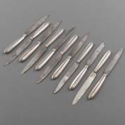 Elf messen met zilveren geprofileerde heften eindigend in een punt en voorzien van metalen lemmeten, meester: Johan P. Dell, Amsterdam, 1788-1807, circa 21 cm lang -lichte gebruikssporen-