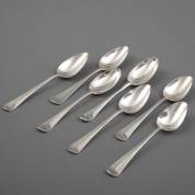 Zeven 2e gehalte zilveren lepels, diverse modellen en meesters, lengte 21 cm, gewicht 464 gram