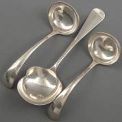 Paar 2e gehalte zilveren sauslepels en een aardappellepel, Haags lof, meester: J.M. van Kempen & Zonen en Zilverfabriek Voorschoten, 1902 en 1928, gewicht 258 gram, aardappellepel lengte 21 cm