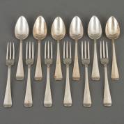 Twaalf 1e gehalte zilveren dinercouverts, Hollands glad, meester: Roelof Helweg Sr., Amsterdam, 1825, 1826, één vork Helweg, 1841, gewicht 1334 gram, lengte circa 21 cm