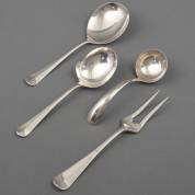 Twee 2e gehalte zilveren groentelepels, slavork en een sauslepel, meester: J.M. van Kempen & Zonen, Voorschoten, 1895, alle dubbelfilet, gewicht 326 gram