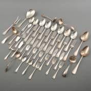 Divers 2e gehalte zilveren bestekdelen, diverse uitvoeringen, enkele gemonogrammeerd, gewicht 741 gram, aardappellepel circa 21 cm