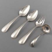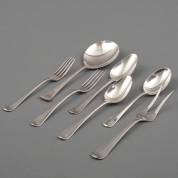 2e gehalte zilveren bestekgedeelte, rondfilet, bestaande uit: zes dinercouverts, extra vork, zes kleine viscouverts, twee dessertlepels, negendelig groot dienbestek en negendelig klein dienbestek, diverse meesters en jaren, waaronder Zilverfabriek Voorschoten, gewicht 2399 gram, groentedienlepel 25 cm, vismes 17 cm
