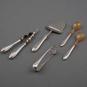 2e gehalte zilveren klontjestang met klauwdecor, daarbij: komkommercouvert, kaasschaaf en notenkraker met 2e gehalte zilveren heften, alle puntfilet, brutogewicht 289 gram, kaasschaaf circa 21 x 7,5 cm