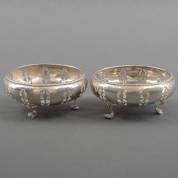 Paar 1e gehalte zilveren bonbonnières met ajourgezaagd decor, op drie klauwpootjes, meester: Mappin & Webster, Birmingham, 1911, gewicht 172 gram, circa 4,5 × Ø 10,5 cm -deukjes-