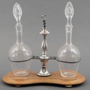 Kristallen olie- en azijnstel in 1e gehalte zilveren houder met slangvormige greep, staand op esdoornhouten voet, essayeursmerk Jan Berend Schöne, Amsterdam, 19e eeuw, 26 × 27 × 11 cm -houders verbogen, één pootje vervangen-