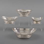 Vier diverse 2e gehalte zilveren bonbonmandjes, alle afgezet met parelrand, 20e eeuw, gewicht 244 gram, grootste circa 5 × 14,5 × 10 cm