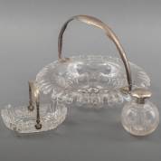 Kristallen schaal met 2e gehalte zilveren hengsel met gegraveerd decor, 1902, geslepen kristallen bonbonschaaltje met 2e gehalte zilveren hengsel, en kristallen flacon met 1e gehalte zilveren montuur en dop, grote schaal Ø 30 cm -kleine chips-