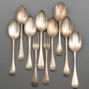 Acht diverse zilveren dinerlepels en twee vorken, enkele gemonogrammeerd, diverse meesters, waaronder: Hendrik Overhulsman, Amsterdam, 1805, en Frederik Rudolf Pregt, Amsterdam, 1752, gewicht 591 gram, grootste lepel 22 cm