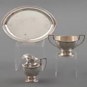 2e gehalte zilveren roomstel, bestaande uit roomkan, suikerschaal met twee greepjes en ellipsvormig dienblad, meester: D. Aubert, 's-Gravenhage, 20e eeuw, gewicht 330 gram, roomkan 9 × 8 × 5 cm