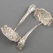 Paar 2e gehalte zilveren strooilepels, de steel gesierd met medaillon, meester: Johannes Lambertus Kroijmans, Oss, 1851, gewicht 58 gram, lengte circa 17 cm
