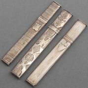Drie 2e gehalte zilveren naaldenkokers, één met gegraveerd bloem- en ananasdecor, meester: Willem Kooiman Jansz., Schoonhoven, 1856-1883, ander meester: Andries Grave Kooiman, Schoonhoven, circa 1850, gewicht 50 gram, circa 10 × 1,5 cm