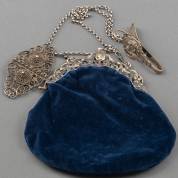 Fluwelen tas met 2e gehalte zilveren beugel, filigrain gespsluiting, chatelainehaak en ketting, brutogewicht 239 gram