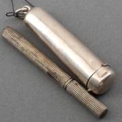 1e gehalte zilveren gladde naaldenkoker, en 2e gehalte zilveren geribde naaldenkoker, gewicht 16 gram -deukjes-