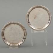 Paar 2e gehalte zilveren flessenonderzetters afgezet met parelrand, meester: J.M. van Kempen & Zonen, Voorschoten, circa 1900, gewicht 141 gram, Ø 11,5 cm