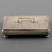 Geribd 2e gehalte zilveren lepeldoosje op vier bolpootjes, scharnierend greepje, en blauw velours binnenwerk, meester: Andries Graves Kooiman, Schoonhoven, 1840, brutogewicht 200 gram, 3 × 13 × 7 cm