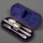 1e gehalte zilveren dessertcouvert met gegraveerd bladdecor, bestaande uit lepel, vork, mes en servetband, Londen, 1873, gewicht 142 gram, lengte lepel circa 16,5 cm, in cassette -cartouche servetband ongegraveerd-
