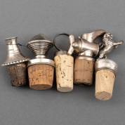 Vijf zilveren flessenstoppen, diverse gehaltes, waaronder één voorzien van schenktuit met kraantje, brutogewicht 68 gram -gebruikssporen-