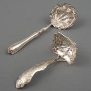 Twee zilveren strooilepels, één 2e gehalte zilver, meester: Martinus Hemelbach, 's-Hertogenbosch, eind 19e eeuw, de ander ongekeurd, vermoedelijk Frans, gewicht 76 gram, 20 en 17 cm