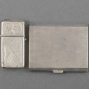 1e gehalte zilveren geguillocheerde sigarettenkoker en 2e gehalte zilveren tondeldoosje met gegraveerd decor, gewicht 108 gram, koker circa 6,5 × 8 cm