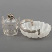 Gelobd opaline hengselmandje met 2e gehalte zilveren hengsel, binnenzijde gemonogrammeerd, daarbij: gekant kristallen dekselpotje met 2e gehalte zilveren roosvormige dekselknop, hengselmand circa Ø 20 cm