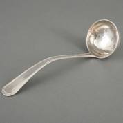 2e gehalte zilveren soepdienlepel, rondfilet, 1870, gewicht 186 gram, circa 30 × Ø 9 cm -bak gedeukt en gerestaureerd-